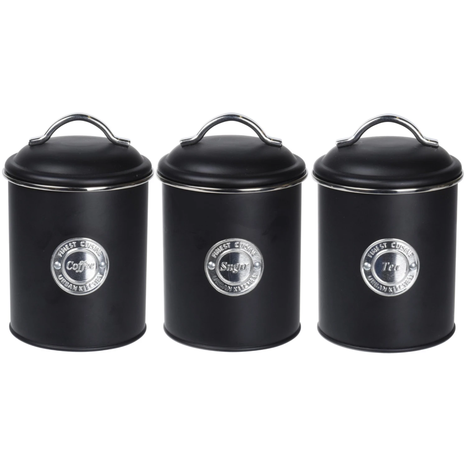 Bewaar je koffie, thee en suiker in deze stoere Excellent Houseware voorraadblikkenset 3-delig. De mat zwarte blikken zijn voorzien van een deksel en hebben aan de voorzijde de tekst; coffee, tea, sugar.